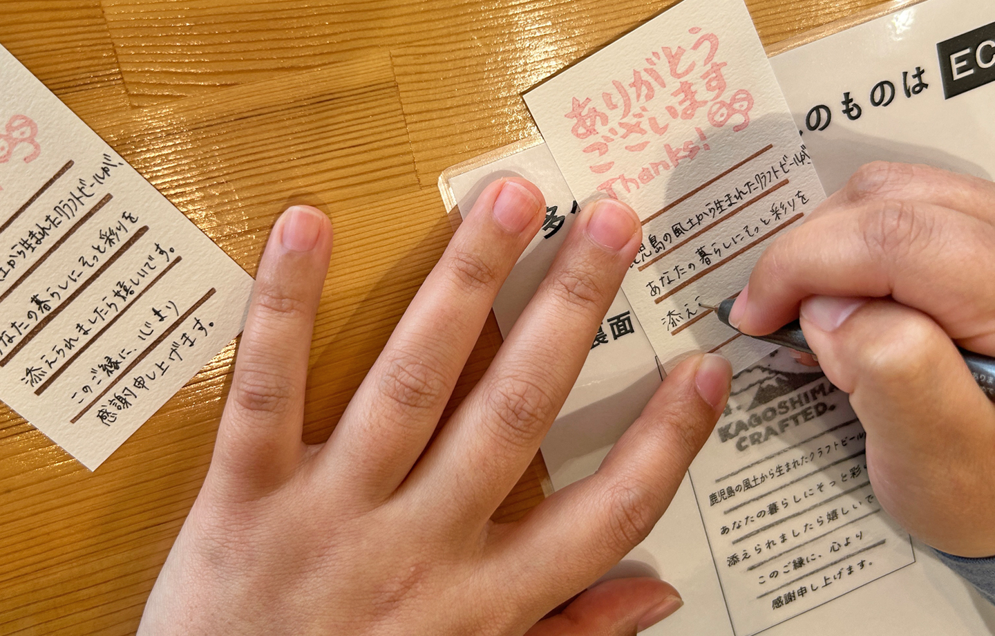 遠方へ発送されることも多いクラフトビール。だからこそ、味わいだけでなく、鹿児島の雰囲気も一緒に感じてもらえたらと思いながら、一枚一枚、丁寧に書いています。