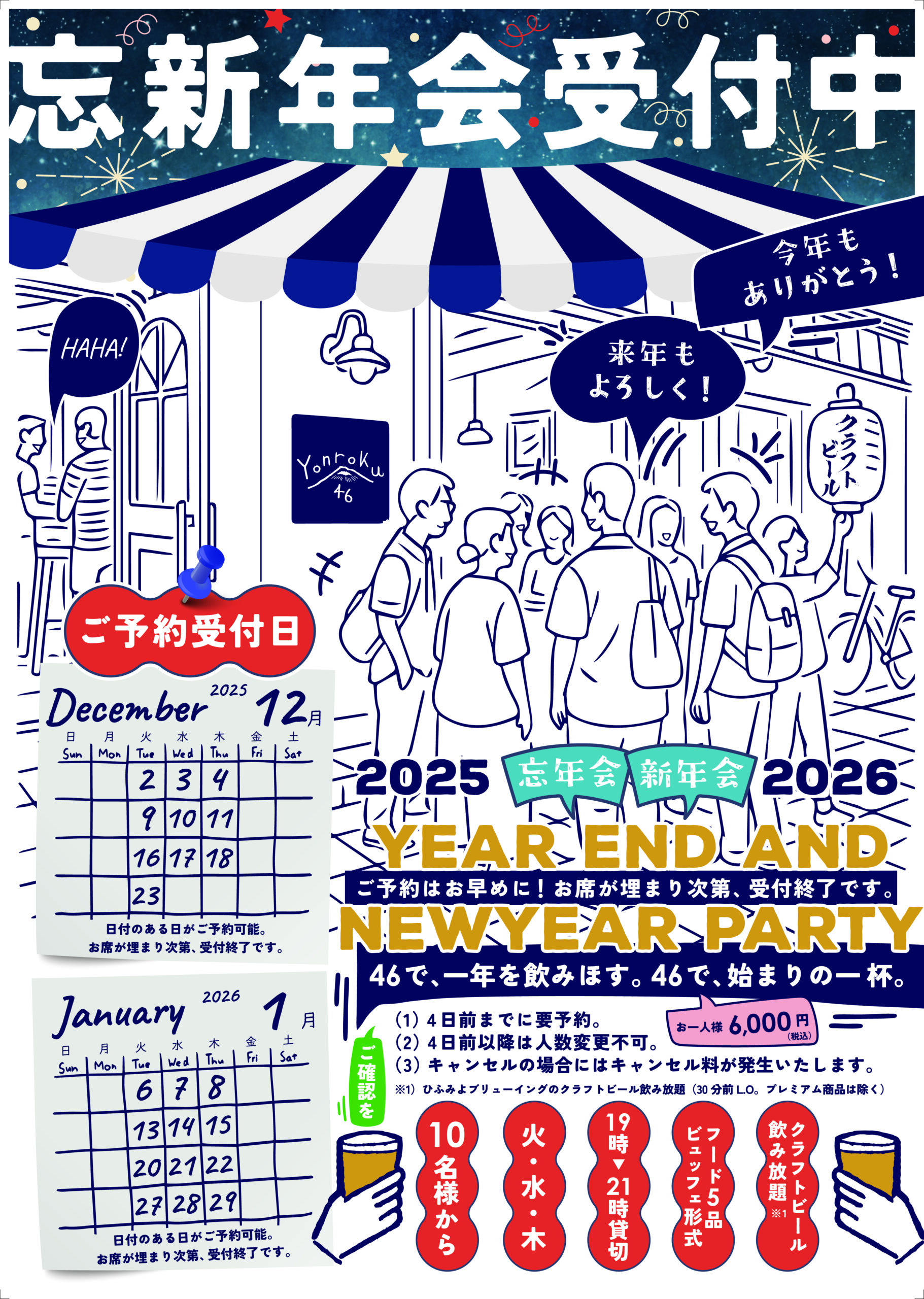 今年一年の感謝と、新しい年のはじまりを“クラフトビール”で乾杯しませんか?ひふみよブリューイング直営のビアバー「46(Yonroku®️)かごしまクラフト」では、初の忘新年会プランの受付を開始しました。気の合う仲間や職場の仲間と、クラフトビールを囲んでゆったり過ごせる特別プランです。