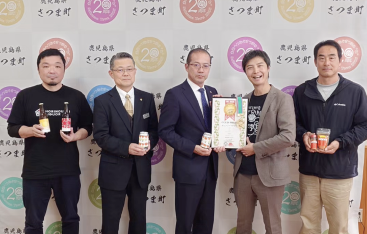世界的なビール品評会「インターナショナル・ビア・カップ(IBC)2025」において、さつま町の特産品を使用したクラフトビール「オレンジノイナズマ」が金賞を受賞したことを受け、さつま町・上野俊市町長を表敬訪問し、受賞の報告を行いました。