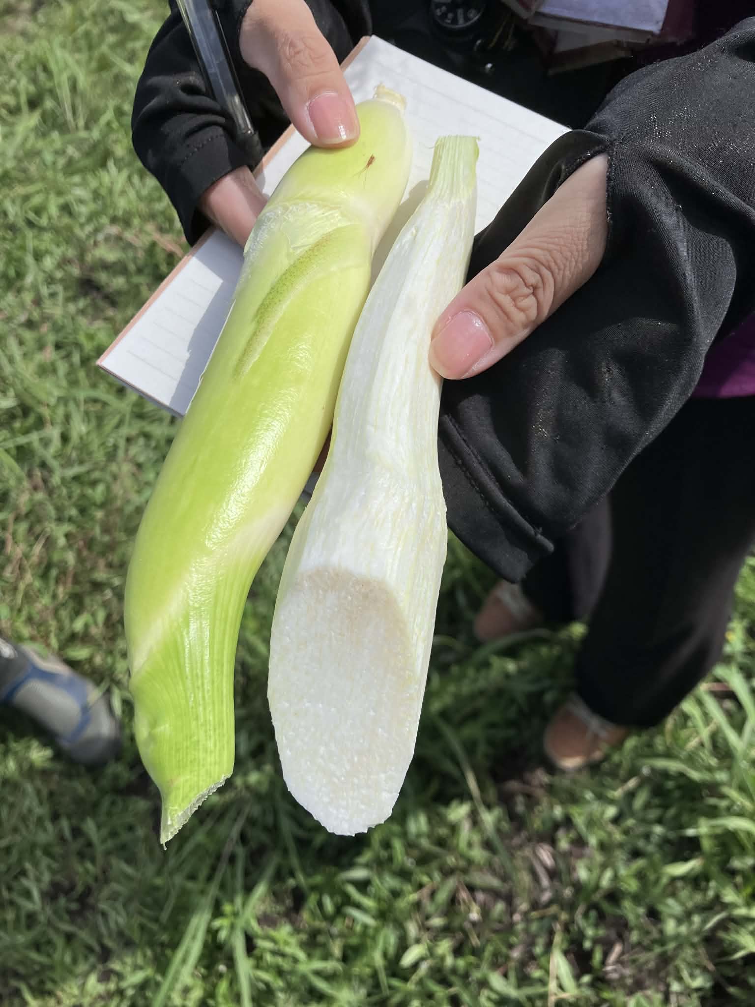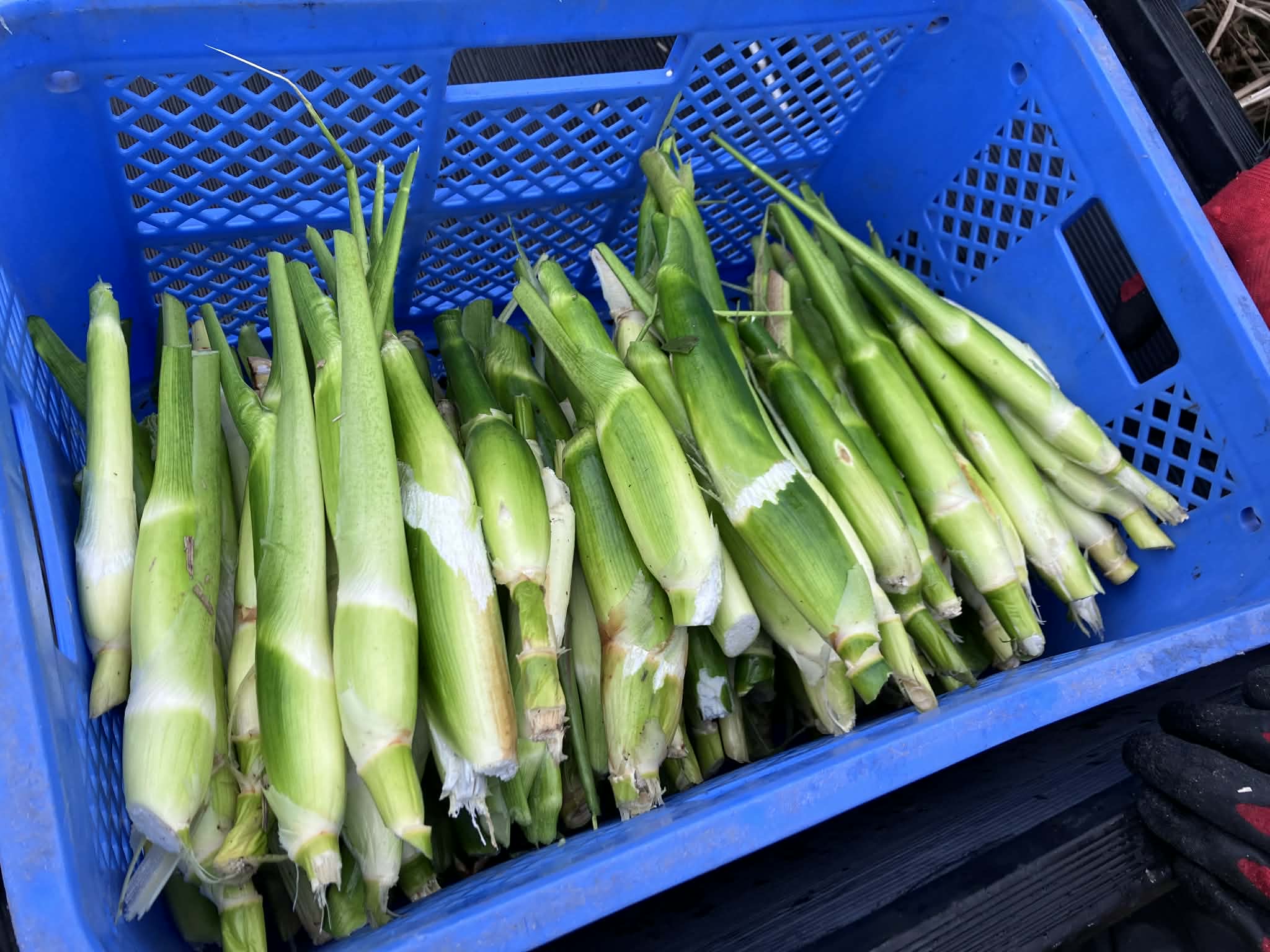 根元のふくらんだ白い部分を狙って、鎌で一気に刈り取ります! 実証初年度ということもあり、「食べごろサイズ」を見分けるのに少し苦労しましたが、無事に最初の収穫を迎えることができました。